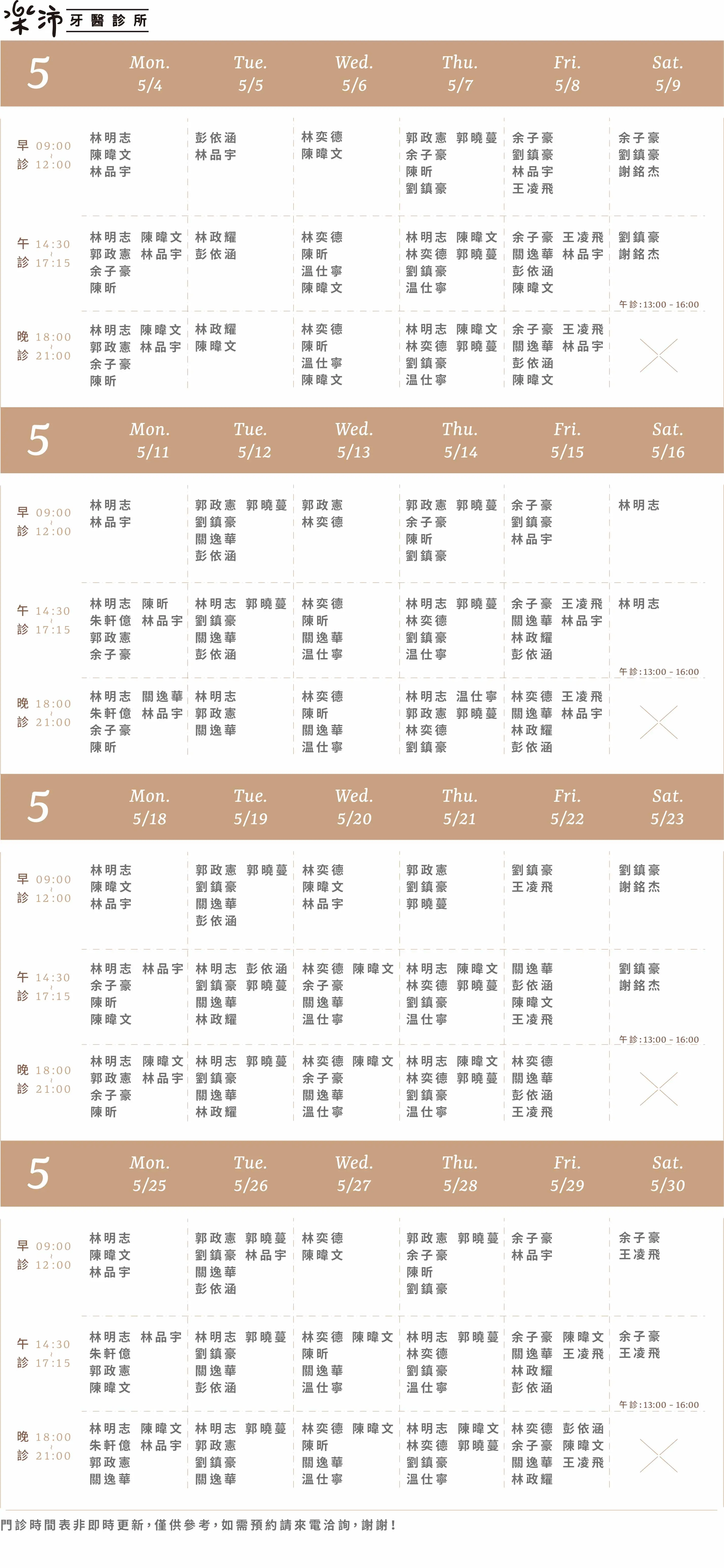 樂沛牙醫診所 Laperle dental clinic 樂沛牙醫診所 Feature 分院特色 Because of the trust built throughout time, I chose Laperle dental clinic. 樂沛取名源於法文珍珠La perle,象徵潔白齒貝之意。樂沛牙醫核心理念為「高規格感染控制、臨床實證醫學、微創牙科治療、全口治療規劃」。 為桃園牙醫中早期即開始邁向數位化的牙醫診所,透過完整的精緻化診療與先進的高階數位設備,以及高規格消毒滅菌流程,我們期望保留閣下最珍貴的牙齒,恢復應有的功能與完美的外觀,讓您能擁有一口好牙及燦爛笑容,並希望每位來看診的民眾都能擁有理想的治療環境並且使用最安心的牙科器械,為桃園八德牙醫推薦首選。 Treatment 診療項目 人工植牙專科 兒童牙醫專科 前牙美學 口腔基本治療 口腔外科 固定式假牙 活動假牙 牙周病專科 牙齒美白 顯微根管專科 Equipment 設備介紹 水雷射 水雷射是一種結合雷射能量與水霧的先進牙科治療設備,可進行蛀牙處理、牙周治療與軟組織手術。治療時震動小、疼痛感低,多數情況不需麻醉,傷口小、恢復快,讓看牙更安心舒適。 高溫真空滅菌消毒鍋 進口真空器械滅菌消毒鍋,依國際標準EN13060,確保所有器械管路都能被高溫高壓完全滅菌,有效執行感染控制,全面杜絕交叉感染。 冷光美白儀器 牙科專用冷光美白儀器,利用LED發光二極體,搭配牙科美白藥劑交互作用,輔助安全且高效率地達到牙齒美白效果。 自體濃縮生長因子血液離心機 將自體血液利用特定的變速離心方式,分離出自體濃縮生長因子,使用於傷口能促進細胞的分化、增生,加強傷口的修復能力。 牙科高倍率顯微鏡 牙科用顯微鏡能將治療視野放大近25倍,讓牙醫師在治療過程能夠更清楚觀察牙齒及牙隨病徵,提供高品質的檢查和治療。 數位口腔掃描儀 即時取得精準的口腔及牙齒3D影像資訊,以數位印模取代傳統印模,讓假牙設計和製作得以數位化,提升效率減少過程不適。 Environment 環境介紹 暖色調結合美式復古風紅磚等的元素,期盼讓來到樂沛牙醫的民眾能感受不同於以往牙科冰冷的形象,並能帶著溫暖、安心的感受接受牙科治療。 A sense of comfort and ease,just like being at home. 衛教諮詢室 X光室 候診區 候診區 診療區 獨立診療室 診療工作區 衛教諮詢室 X光室 候診區 候診區 診療區 獨立診療室 診療工作區 Dentist 醫療團隊 關逸華 全口照護醫師 陳昕 全口照護醫師 彭依涵 全口照護醫師 劉鎮豪 全口照護醫師 溫仕寧 顯微根管專科醫師 郭政憲 齒顎矯正專任醫師 朱軒億 全口照護醫師 林品宇 全口照護醫師 陳暐文 全口照護醫師 謝銘杰 口腔外科專科醫師 郭曉蔓 全口照護醫師 林明志 植牙手術專任醫師 余子豪 全口照護醫師 林奕德 全口照護醫師 林政耀 矯正植牙專任醫師 王凌飛 全口照護醫師 Schedule 門診時間 本月下月 Information 診所資訊 03 377 0885 334桃園市八德區大智路131號 Google Map 自行線上約診 客服協助預約 Traffic 交通方式 1. 自行開車停車資訊建議: 🚗力揚八德廣豐二(走路1-2分鐘) 📍桃園市八德區大智路152號 💰收費 平日:20元/小時,當日最高100元 假日:30元/小時,當日最高120元 🚗 廣豐新天地(置地生活廣場)地下停車場(走路5分鐘) 📍334桃園市八德區介壽路一段728號 💰收費 汽車/重機 : 1小時40元 機車 : 一次30元 2. 大眾運輸最近公車站牌:廣豐新天地 下車後,步行約 3-5 分鐘即可抵達診所。 公車路線主要起迄點途經地點GR2桃園—八德桃園火車站、桃園監理站、大湳102桃園—景雲新村桃園火車站157桃園—新興高中桃園火車站201蘆竹—八德區公所蘆竹、南崁、經國轉運站5000 / 5008 / 5010 / 5011往返桃園、中壢、龍潭、大溪等長途路線,多數在介壽路設有站牌。