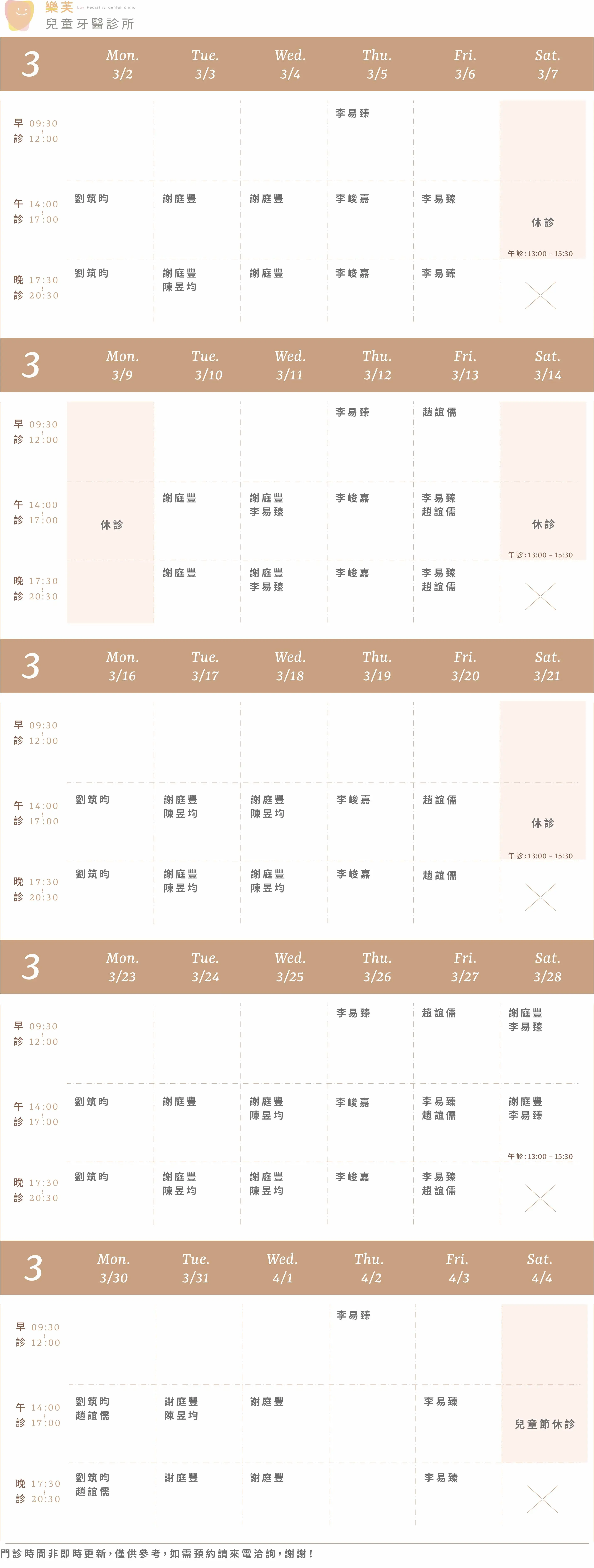 樂芙兒童牙醫 Luv pediatric dental clinic 樂芙兒童牙醫 Feature 分院特色 Because of the trust built throughout time, I chose Luv pediatric dental clinic. 桃園樂芙兒童牙醫擁有親切溫柔的兒童牙醫師群,以及適合孩子看牙的友善空間環境,帶著孩子一步步從小學習養成好的牙齒保健習慣,並擁有一口健康的好牙。 Treatment 診療項目 兒童牙醫專科 Equipment 設備介紹 鎮靜麻醉 透過電腦的控制將鎮靜藥物注入體內的一種過程,依據每位兒童不同的身高體重,進而精密的計算出兒童能夠承受最低限度的麻醉劑量,讓兒童處於睡覺的狀態下去進行牙科治療,協同麻醉專科醫師全程監控生命徵象。 束縛版 治療過程,若孩童持續無法配合看診,則建議以束縛板保護小朋友。避免小朋友在治療過程中,因為害怕而亂動, 導致尖銳的器械傷及口內、臉頰及舌頭,甚至吞入牙科器械。 笑氣鎮靜 牙科常用30%~50%笑氣合併70%~50%氧氣,高安全性,能協助孩童在看牙時消除緊張、恐懼及憂慮感,使孩童保持愉快且放鬆的就診狀態。 Environment 環境介紹 樂芙兒童牙醫以家的概念為環境設計主題,陪伴孩子一同成長,並從小培養正確牙齒保健觀念,讓看牙也能成為一種遊樂。 A sense of comfort and ease,just like being at home. X光室 候診區 治療室 X光室 候診區 治療室 Dentist 醫療團隊 劉筑昀 衛福部兒童牙醫專科醫師 謝庭豐 衛福部兒童牙醫專科醫師 李峻嘉 兒童牙醫專任醫師 趙誼儒 衛福部兒童牙醫專科醫師 陳昱均 兒童牙醫專任醫師 李易臻 衛福部兒童牙醫專科醫師 Schedule 門診時間 本月下月 Information 診所資訊 03 363 8300 桃園市八德區廣豐三街8號1樓 Google Map 自行線上約診 客服協助預約 Traffic 交通方式 1. 自行開車停車資訊建議: 🚗力揚八德廣豐二(走路1-2分鐘) 📍桃園市八德區大智路152號 💰收費 平日:20元/小時,當日最高100元 假日:30元/小時,當日最高120元 🚗 廣豐新天地(置地生活廣場)地下停車場(走路6分鐘) 📍334桃園市八德區介壽路一段728號 💰收費 汽車/重機 : 1小時40元 機車 : 一次30元 2. 大眾運輸最近公車站牌:廣豐新天地 下車後,步行約 3-5 分鐘即可抵達診所。 公車路線主要起迄點途經地點GR2 桃園—八德桃園火車站、桃園監理站、大湳201蘆竹—八德蘆竹、南崁、經國轉運站726A八德—高鐵桃園站八德轉運站、大湳其他路線(多條路線)102、157、5000、5008、5010、5011 等多條經介壽路往返桃園與八德、大溪的路線,皆在「廣豐新天地」設有站點。