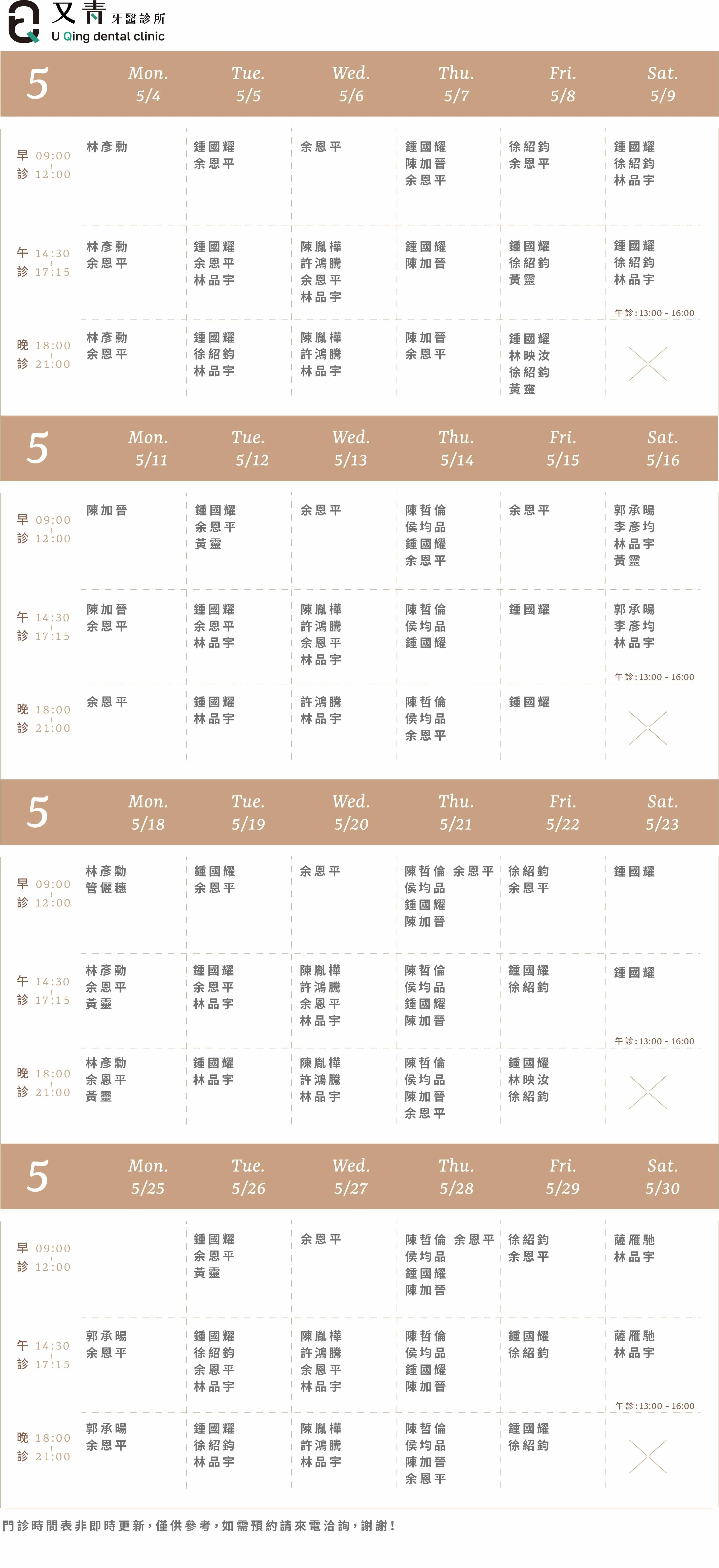 又青牙醫診所 Uqing detal clinic 又青牙醫診所 Feature 分院特色 笑容與快樂源自一口健康好牙 又青牙醫團隊擁有兒童牙醫門診及all on 4全口重建、人工植牙、齒顎矯正、根管治療、假牙贗復等專科,深耕桃園中壢的青埔地區,口碑優質的中壢牙醫推薦,全方位照護您的口腔健康。又青青埔牙醫推薦,提供專業、信任及舒適的牙科醫療,牙齒美學到兒童牙醫保健,專業醫療團隊讓您重拾口腔健康,展現自信笑容。 Treatment 診療項目 人工植牙專科 兒童牙醫專科 前牙美學 口腔基本治療 口腔外科 固定式假牙 活動假牙 牙周病專科 牙齒美白 顯微根管專科 齒顎矯正專科 Equipment 設備介紹 Environment 環境介紹 在桃園青埔,又青牙醫以溫柔守護每一份信任。我們深知看牙的忐忑,因此致力營造如家般的舒適感。從專業的人工植牙、全口重建到貼心的兒童牙科,醫師團隊陪伴您循序漸進,讓看牙成為重拾自信笑容的起點。 A sense of comfort and ease,just like being at home. 候診空間 診療環境 獨立諮詢室 獨立診間 X光室 候診空間 診療環境 獨立諮詢室 獨立診間 X光室 Dentist 醫療團隊 許鴻騰 矯正植牙專任醫師 徐紹鈞 全口照護醫師 侯均品 全口照護醫師 陳加晉 牙髓病科醫師 林映汝 齒顎矯正專科醫師 林彥勳 植牙手術專任醫師 李彥均 齒顎矯正專任醫師 陳哲倫 全口照護醫師 余恩平 全口照護醫師 陳胤樺 牙周植牙專科醫師 管儷穗 兒童牙科專任醫師 林品宇 全口照護醫師 黃靈 兒童牙科專科醫師 薩雁馳 口腔外科專任醫師 鍾國耀 全口照護醫師 郭承暘 全口照護醫師 Schedule 門診時間 本月下月 Information 診所資訊 03 287 7028 320桃園市中壢區高鐵站前西路二段59號 Google Map 客服協助預約 Traffic 交通方式 1. 自行開車停車資訊建議: 路邊停車格: 診所周邊的高鐵站前西路二段、致祥一街等有路邊收費停車格。 大型停車場: 步行距離內有付費停車位可供利用,例如: 華泰名品城 (Gloria Outlets) 停車場 高鐵桃園站附設停車場 2. 公車高鐵桃園站周邊有多條公車路線,可以搭乘至附近站牌後再步行。 建議公車站牌: 建議可搭乘至 「高鐵桃園站」 或 「華泰名品城」 站,再沿著高鐵站前西路二段步行前往。 公車路線範例: 5089、5087、170、高鐵快捷公車(如 705 往返桃園國際機場)等許多往返中壢、桃園市區或連接機場的公車路線皆會經過此區域。 3. 台灣高鐵 (THSR) / 桃園機場捷運高鐵: 搭乘高鐵至 「桃園站」 下車。 從車站出口步行至診所(高鐵站前西路二段)約需 10-15 分鐘。 桃園機場捷運 (A18 站): 搭乘機捷至 「高鐵桃園站 (A18)」 下車。 從捷運站出口步行至診所約需 10-15 分鐘。