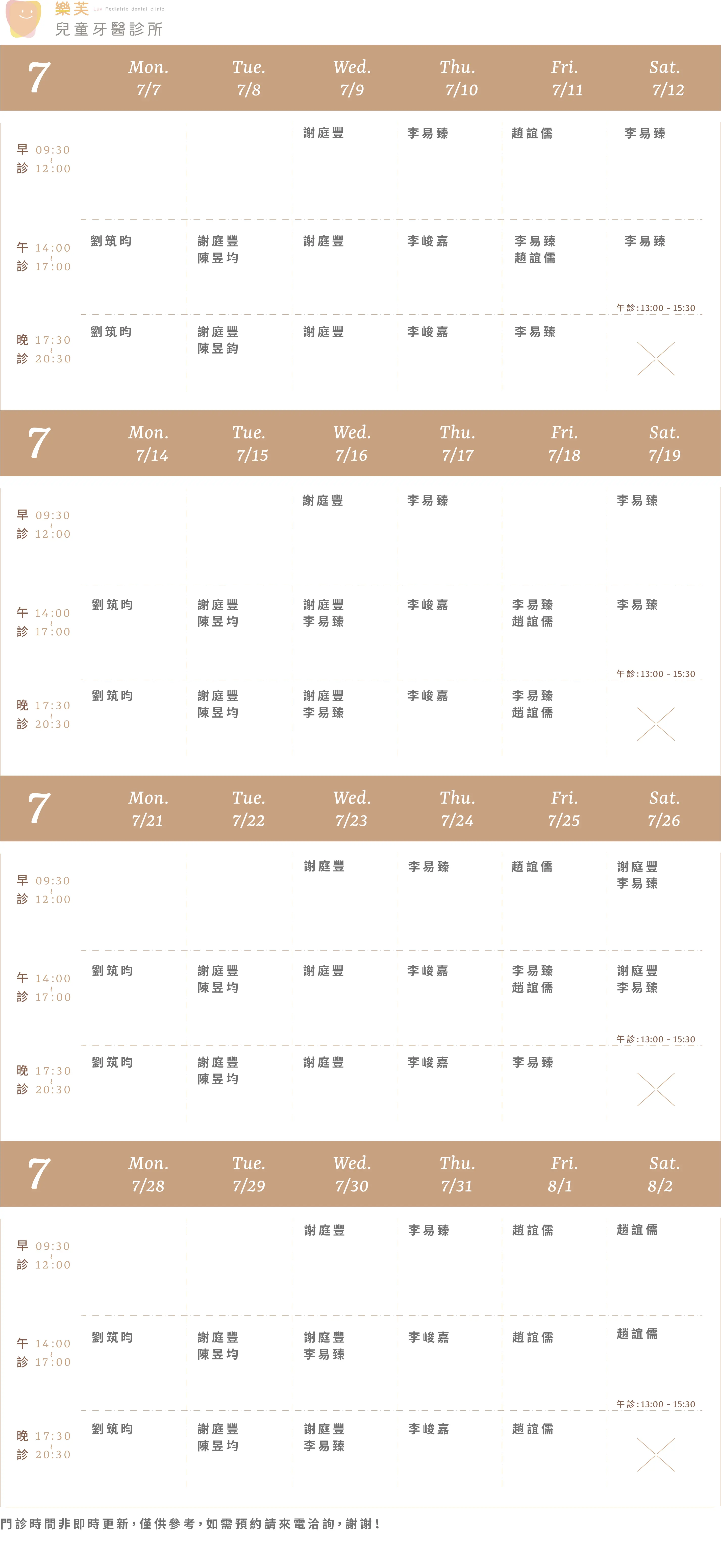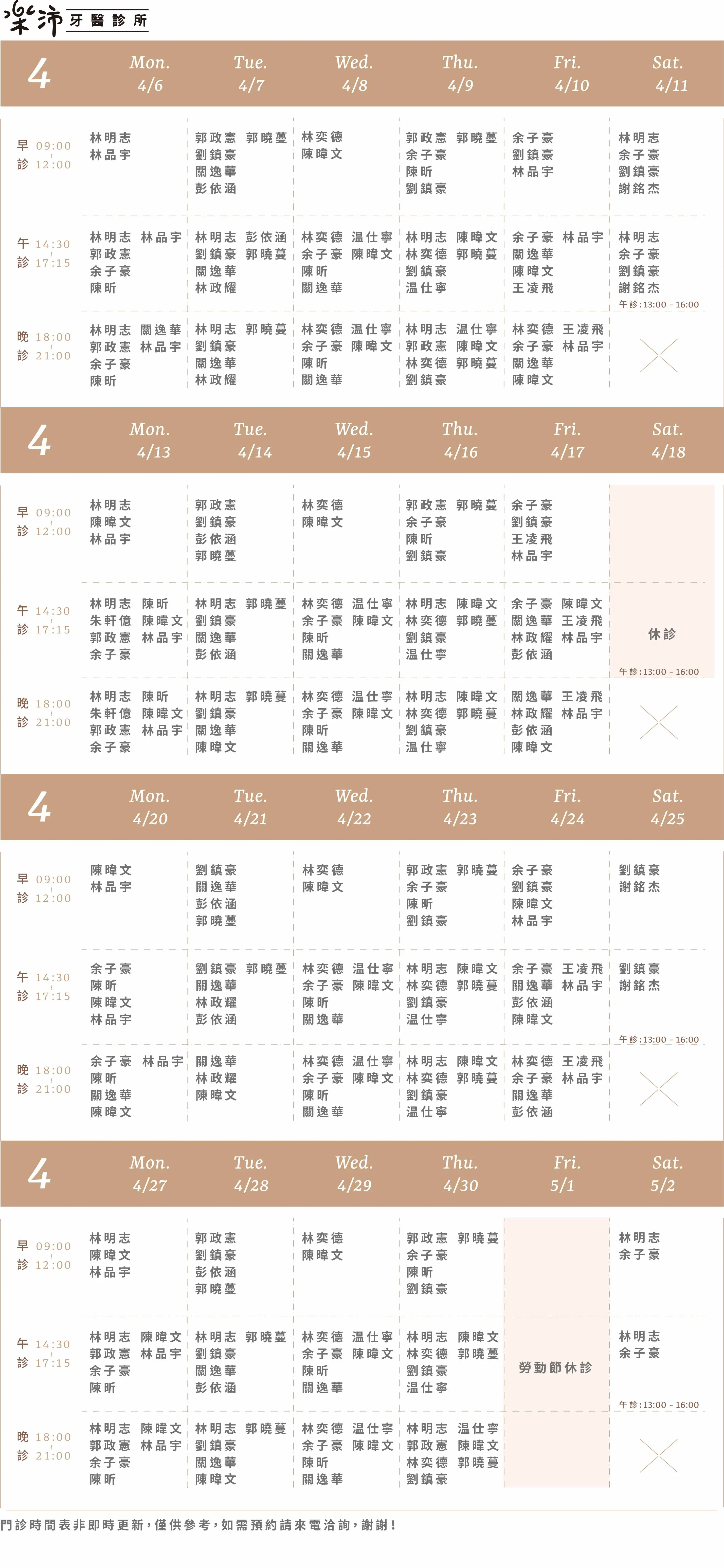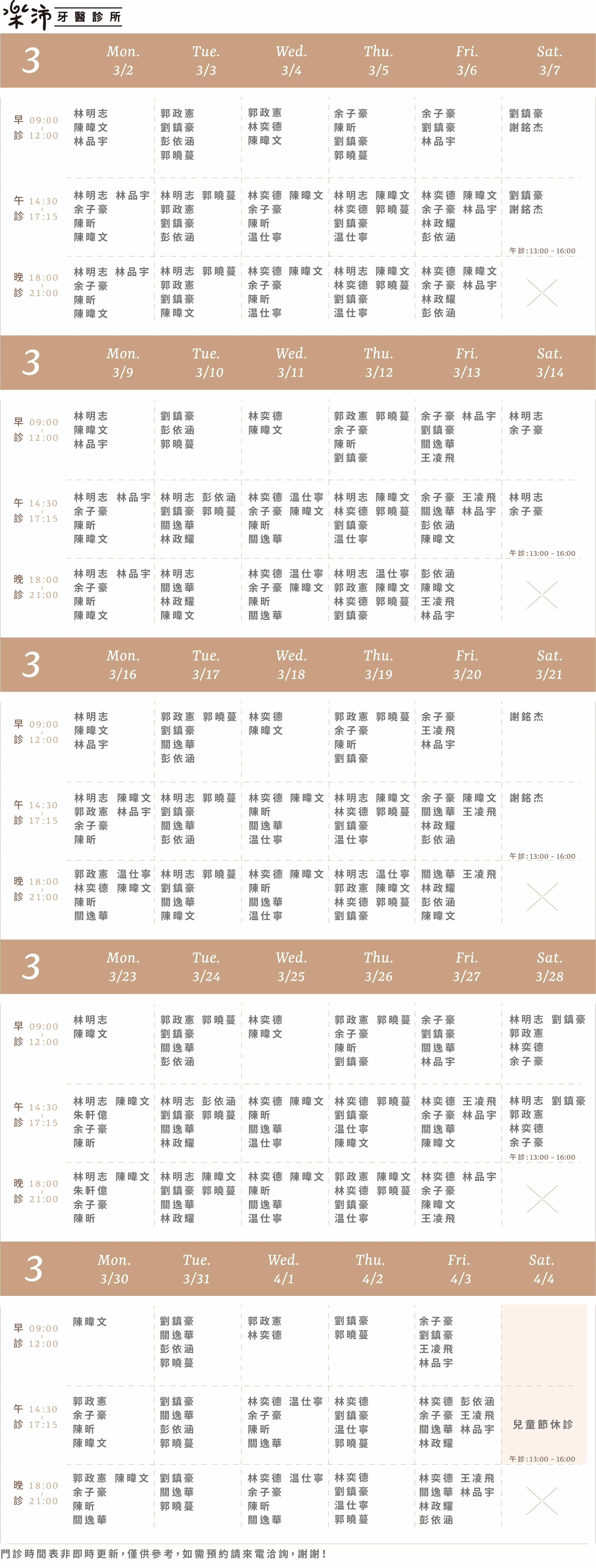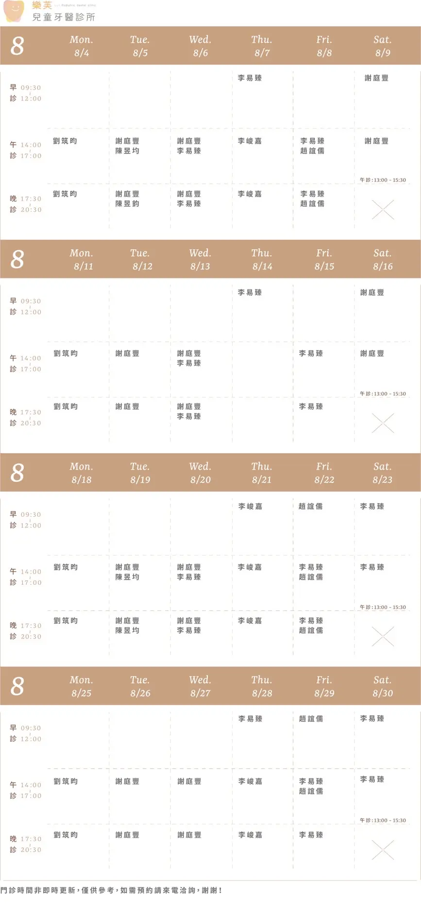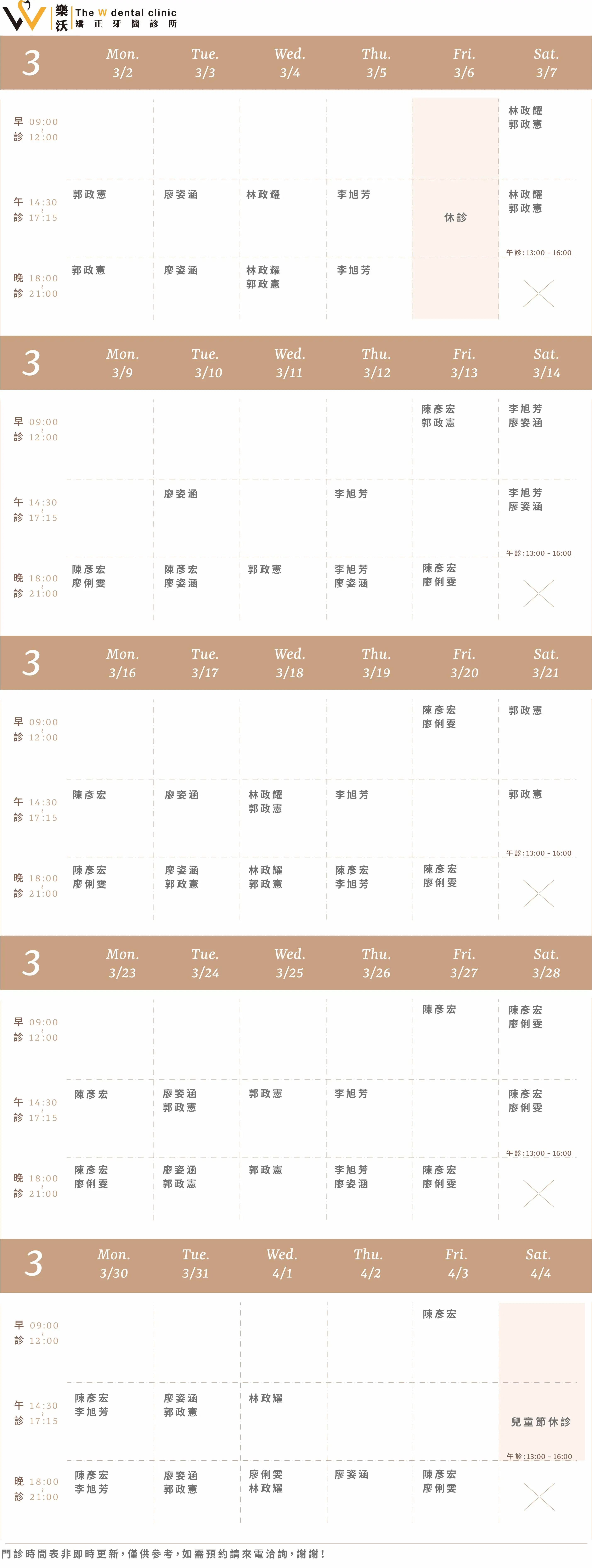 樂沛牙醫 樂芙兒童牙醫 樂陽牙醫 樂沃矯正牙醫 又青牙醫 本月下月 Information 診所資訊 03 377 0885 334桃園市八德區大智路131號 Google Map 自行線上約診 客服協助預約 本月下月 Information 診所資訊 03 363 8300 桃園市八德區廣豐三街8號1樓 Google Map 自行線上約診 客服協助預約 本月下月 Information 診所資訊 03 336 9995 330桃園市桃園區力行路385巷25號 Google Map 自行線上約診 客服協助預約 本月下月 Information 診所資訊 03 363 7380 334桃園市八德區公園路92號 Google Map 客服協助預約 本月下月 Information 診所資訊 03 287 7028 320桃園市中壢區高鐵站前西路二段59號 Google Map 客服協助預約