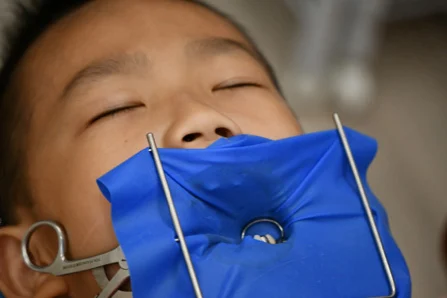治療過程中,會幫小朋友夾上一層有彈性的小雨衣, 目的是為了隔離、保護治療中的牙齒,保持操作的環境清潔,也避免口水污染! 此外,小雨衣也可以避免小朋友不小心吞入器械的可能!