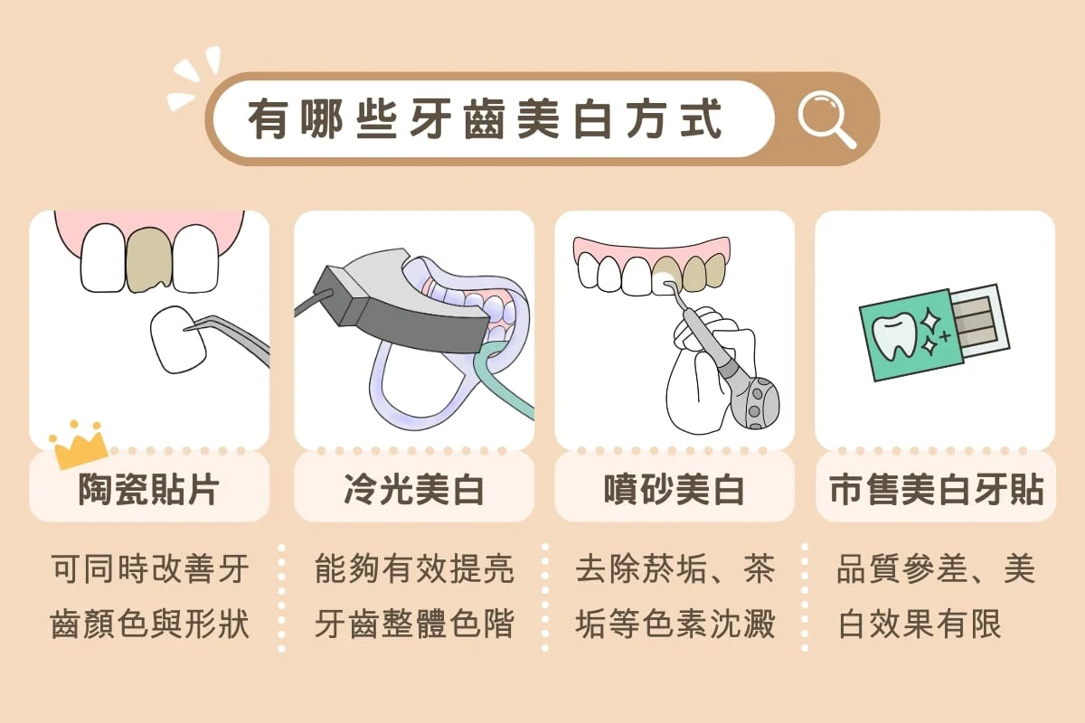 美白效果因人而異,價格相對便宜,可在家自行操作,可能引起牙齒敏感、牙齦刺激等副作用。
