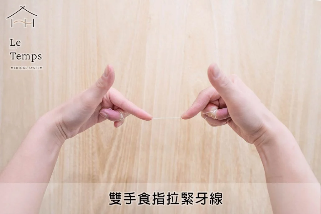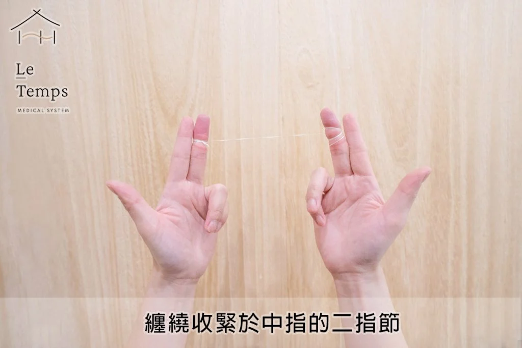 step 2.將牙線纏繞收緊於左右手中指的第二指節(纏繞緊度應適中)