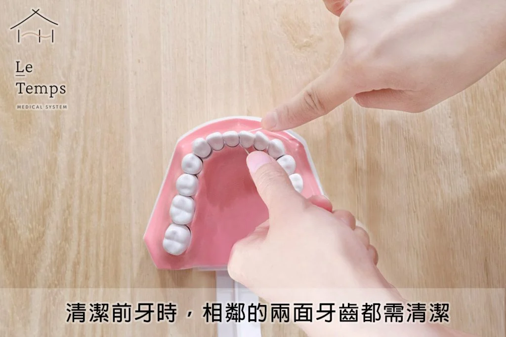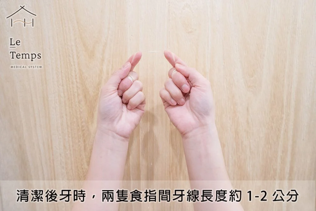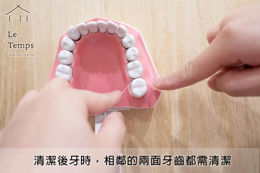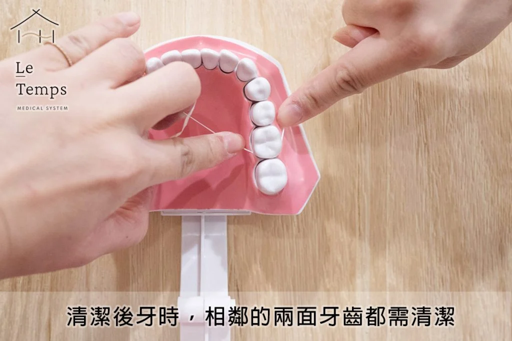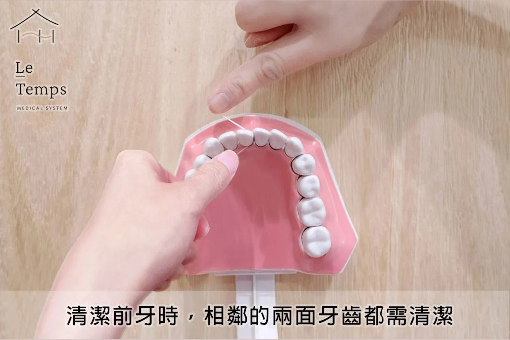 牙線在操作時要繃緊牙縫面,自然成現C型,每顆牙齒相鄰的兩面都需確實清潔乾淨,用過的牙線段要更換另一段乾淨的牙線,再進行下一顆牙。