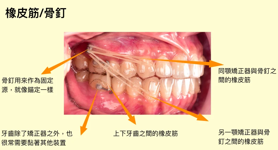 迷你骨釘『又稱為骨釘』是植入齒槽骨的一時性迷你植體,骨釘是提供牙齒矯正施力的固定源,幫忙拉動牙齒。骨釘會打在牙齦上,搭配拉橡皮筋來提高牙齒移動的速度。