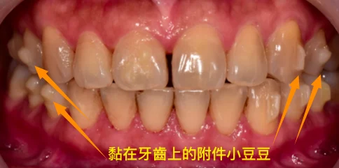 附件是隱形矯正器最重要的輔助裝置之一,一個附件對應一顆牙齒,作用為「固定位置」是幫助控制牙齒朝哪個方向移動,隱適美的小附件不同的形狀有不同的功能,黏在牙齒上一顆顆突起的豆豆,有半月形、方形,都是隱適美的獨家專利。黏上附件後(也就是牙齒表面的小豆豆),牙套會更抓住牙齒,讓牙套和牙齒之間更加貼合和穩固。