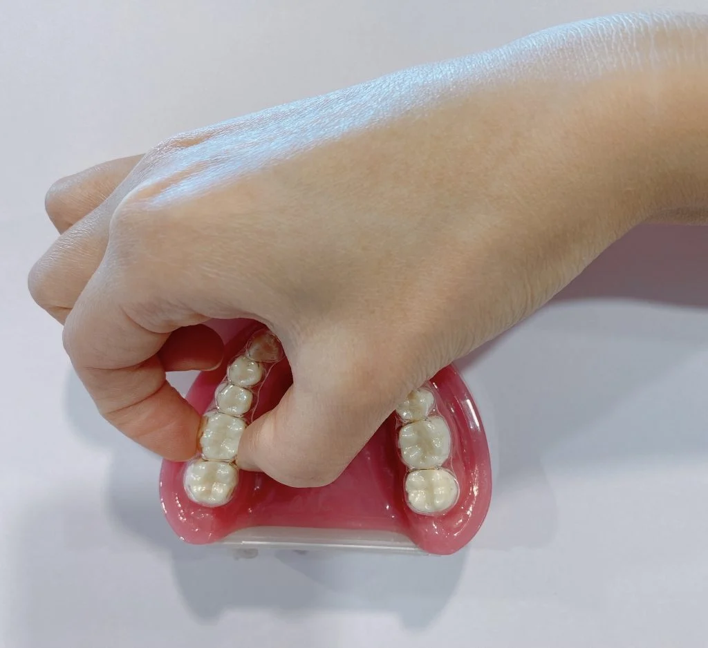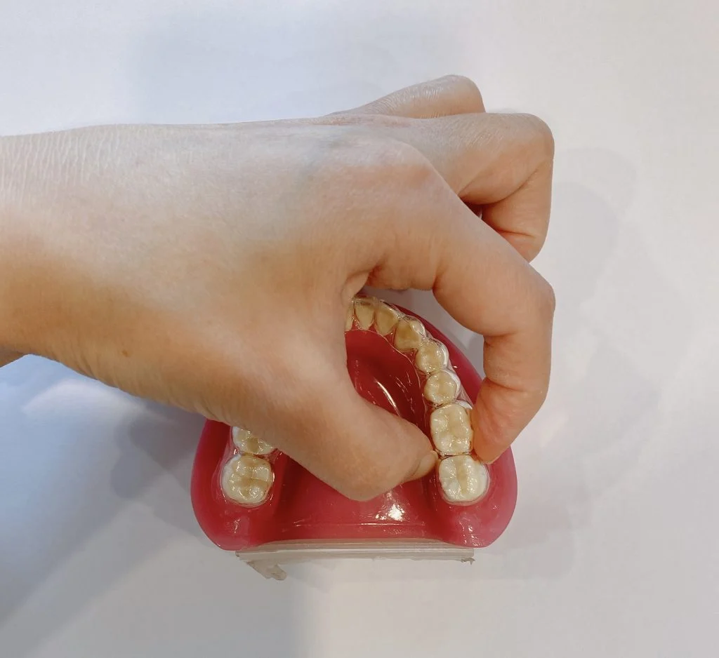 拿下牙套時,手摳「對側」的牙套(左手摳右邊牙套內側,右手摳左邊牙套內側)