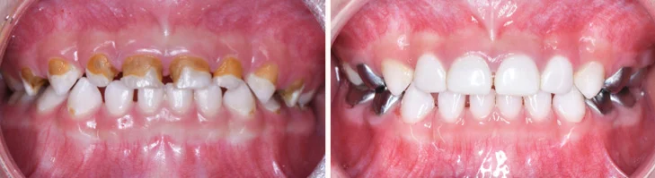 蛀牙範圍過大或是做過根管治療的乳牙,以選擇以全瓷牙冠方式保護! 牙齒顏色的全瓷牙冠顏色美觀也很耐用!