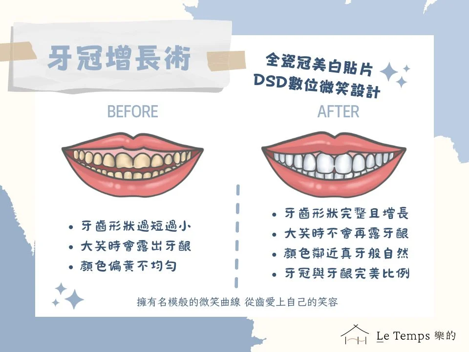 若覺得牙齒太小顆不好看,笑起來牙齦外露不美觀都可以使用全瓷美容貼片來改變,但全瓷美容貼片的限制即在於「無法調整牙冠與牙齦的比例」,必須透過搭配牙冠增長術,客製化修磨調整牙冠與牙齦的比例,讓您擁有一口完美的牙齒與燦爛的笑容。