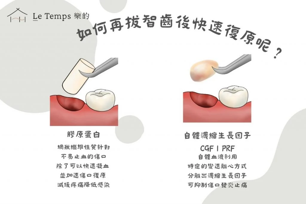 正常情況下,拔完智齒大約7天左右傷口的血塊才會被肉芽組織漸漸替代,約至半個月時傷口基本上就能比較穩定,一個月左右上皮組織形成,再來齒槽內骨細胞才會逐漸形成。如果想要加速恢復的過程,則可以針對傷口使用膠原蛋白或自體濃縮生長因子(CGF),皆能加快傷口復原的速度。