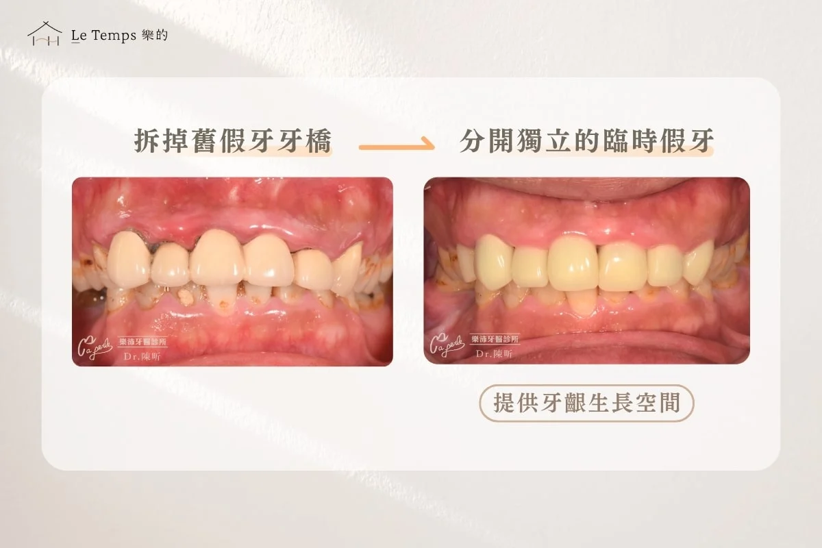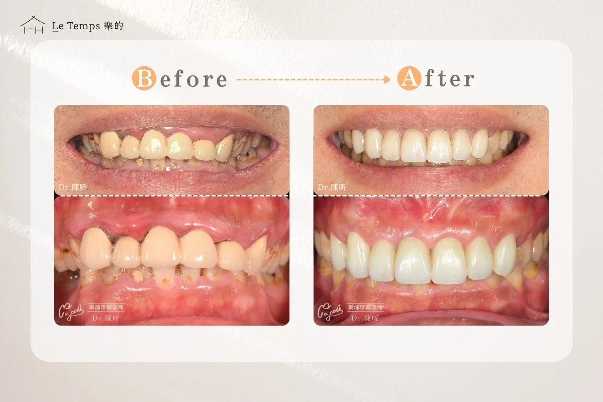 從術前照片明顯可見牙齒矮胖、假牙不自然的狀況,到術後牙齒比例修長、笑容乾淨有神,整體氣質煥然一新。
