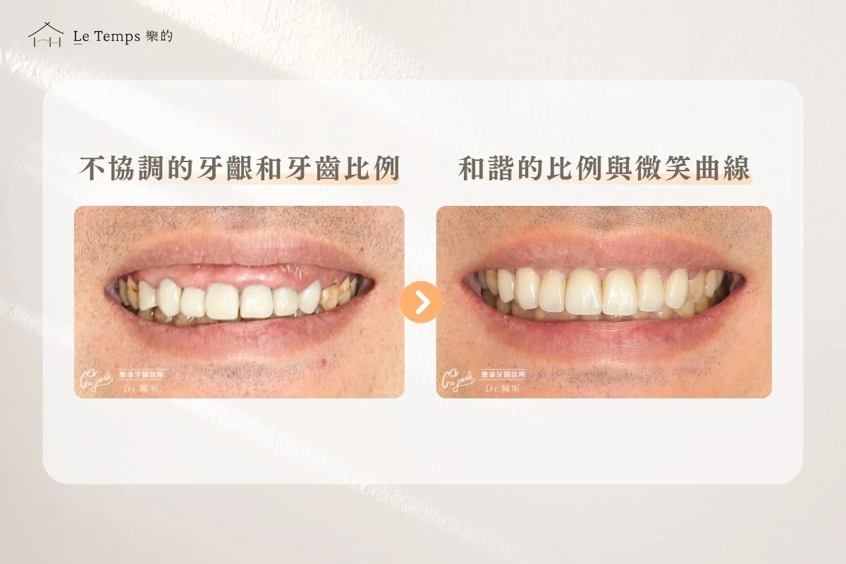 在陳醫師的門診評估後,他決定透過牙冠增長術來改善牙齒比例與笑齦問題,同時以仿生全瓷冠取代原本不自然的假牙,重拾自然的微笑。