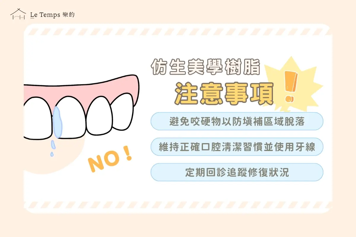 • 避免啃咬過硬的食物,可減少樹脂填補區的脫落風險。