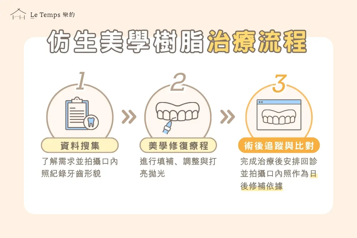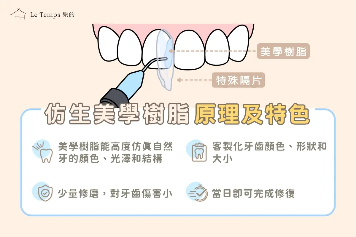 治療過程中,會使用高拋光度的樹脂,搭配特殊的隔片進行牙齒外型的調整。在填補完成後,會使用多種工具進行表層拋光,使樹脂表面呈現接近原本牙齒的顏色。