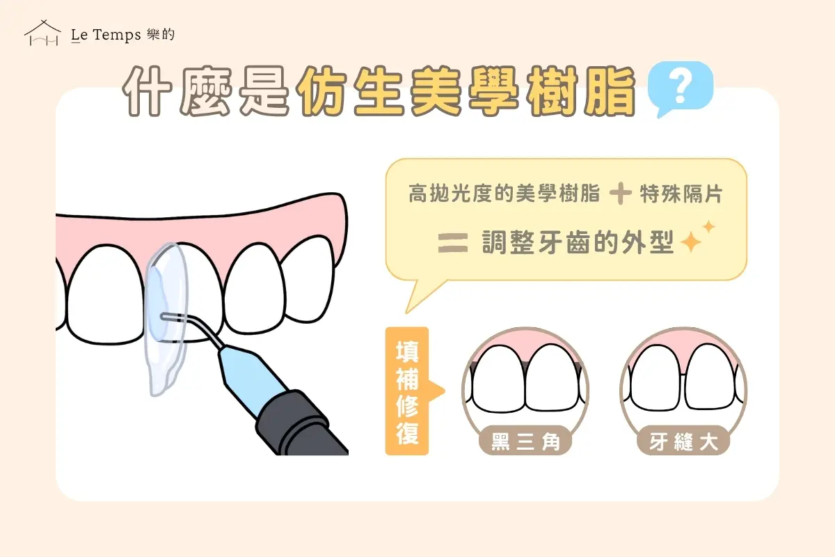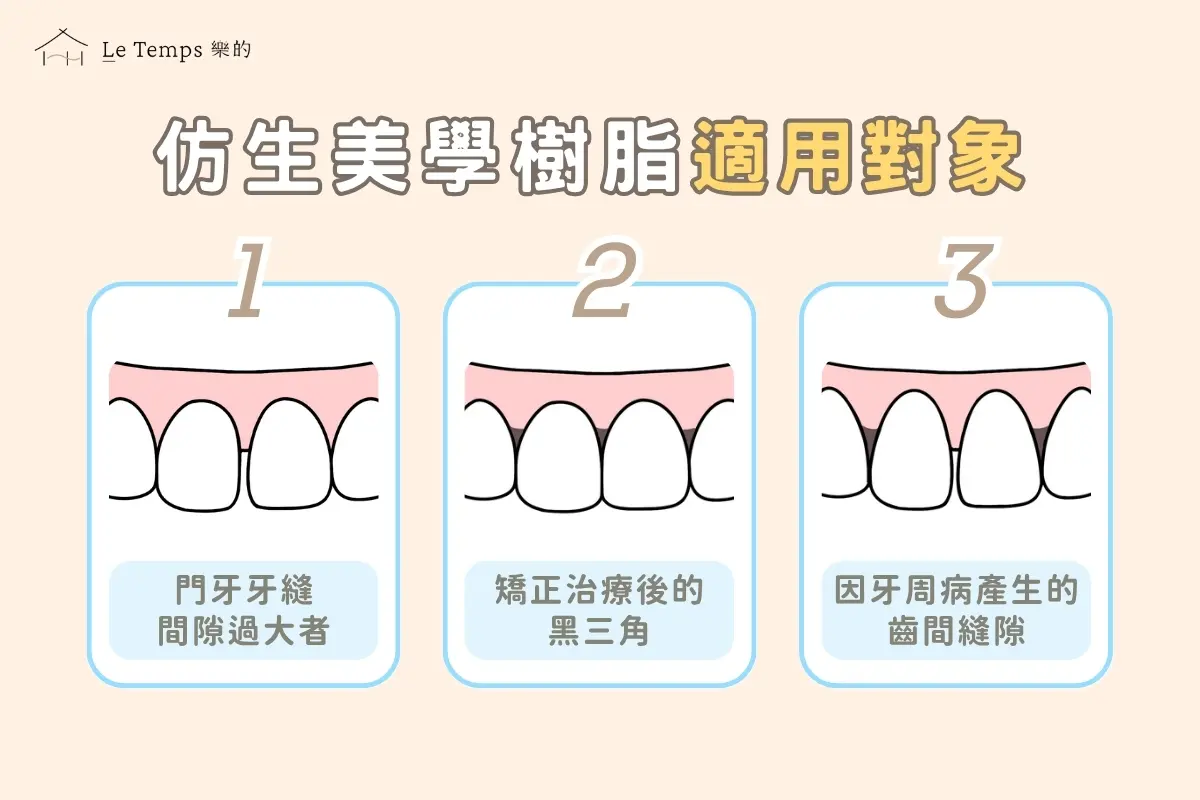 當患者在牙周病治療結束或矯正治療完成後,因為牙齦萎縮或牙齒排列改變,可能會出現明顯的黑三角空隙或牙縫,這時就可以透過仿生美學樹脂來填補修復。