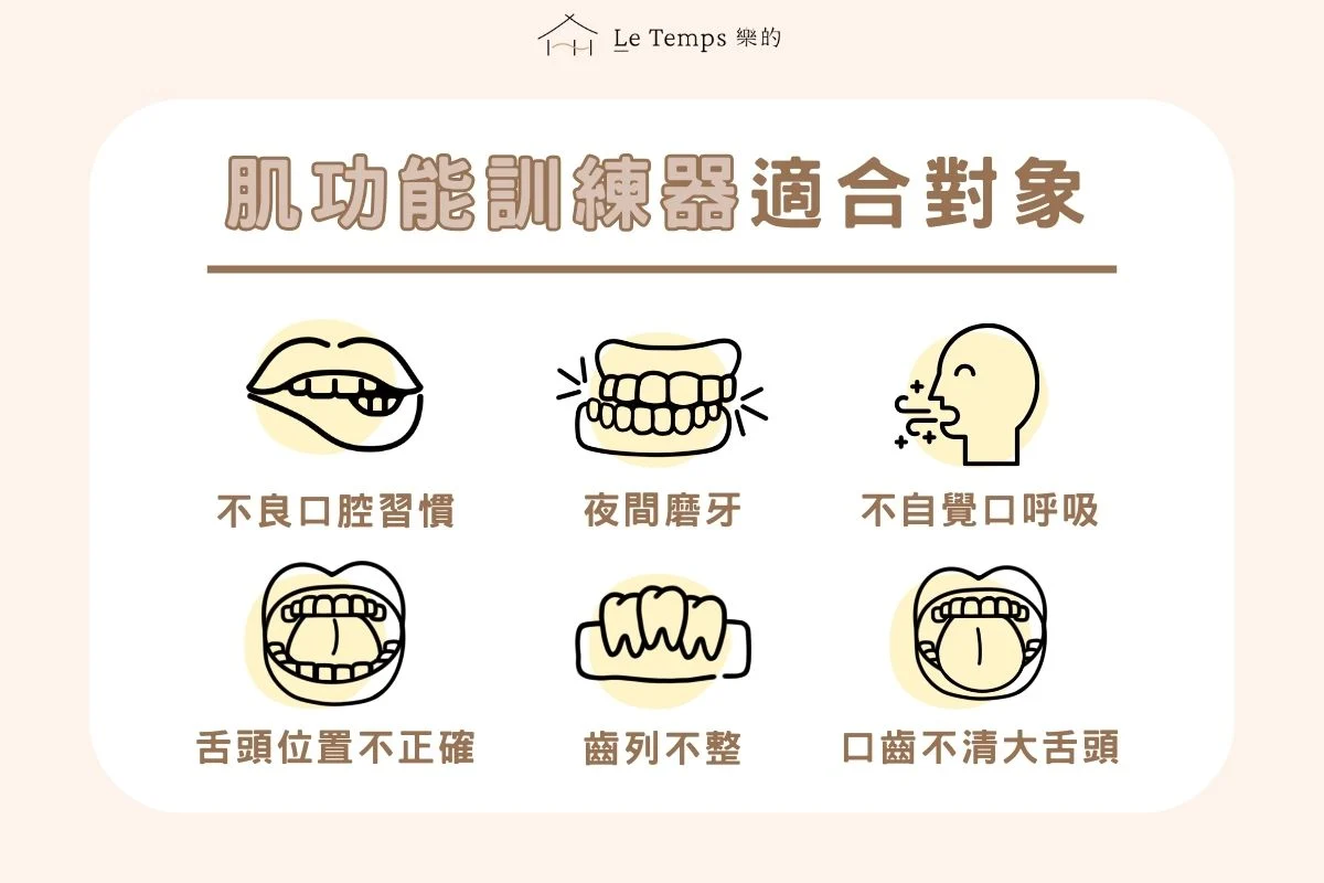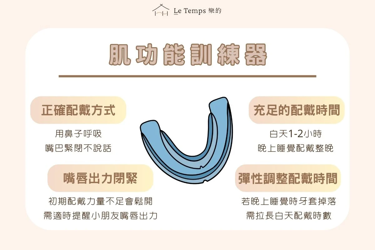 醫師透過肌功能訓練器訓練孩子正確的呼吸方式、咬合吞嚥以及舌頭擺放位置。當肌肉發力恢復正常,牙床位置及空間也會開始變得穩定許多,不僅能使牙齒整齊排列,也能降低日後矯正的困難度。