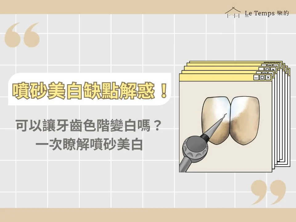 噴砂美白是一種無害的非侵入性牙齒美白療程,主要是運用物理原理,透過空氣加壓方式混合小蘇打粉末和水,通過噴砂裝置創造出強力水柱,清除因長期喝茶、咖啡等易染色食物於牙齒表面所形成之沉澱色素或牙菌斑,適用牙齒有菸垢、茶漬、咖啡垢,或檳榔垢患者。